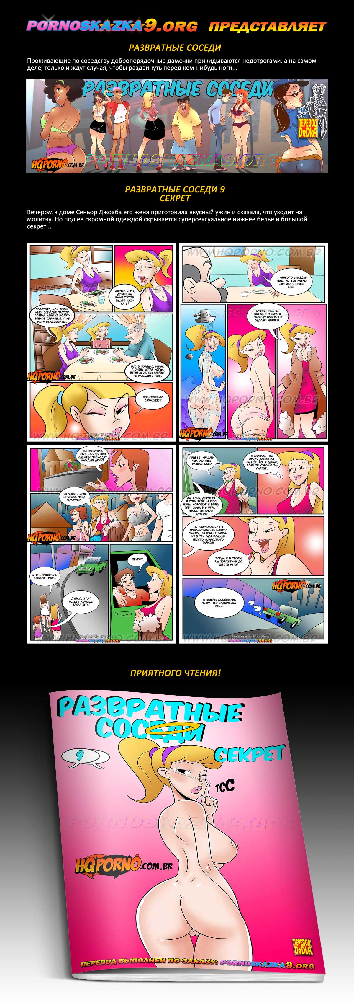 Порно комикс «Развратные соседи. Часть 9. Секрет.» Вечером в доме Сеньор Джоаба его жена приготовила вкусный ужин и сказала, что уходит на молитву. Но под ее скромной одеждой скрывается суперсексуальное нижнее белье и большой секрет…