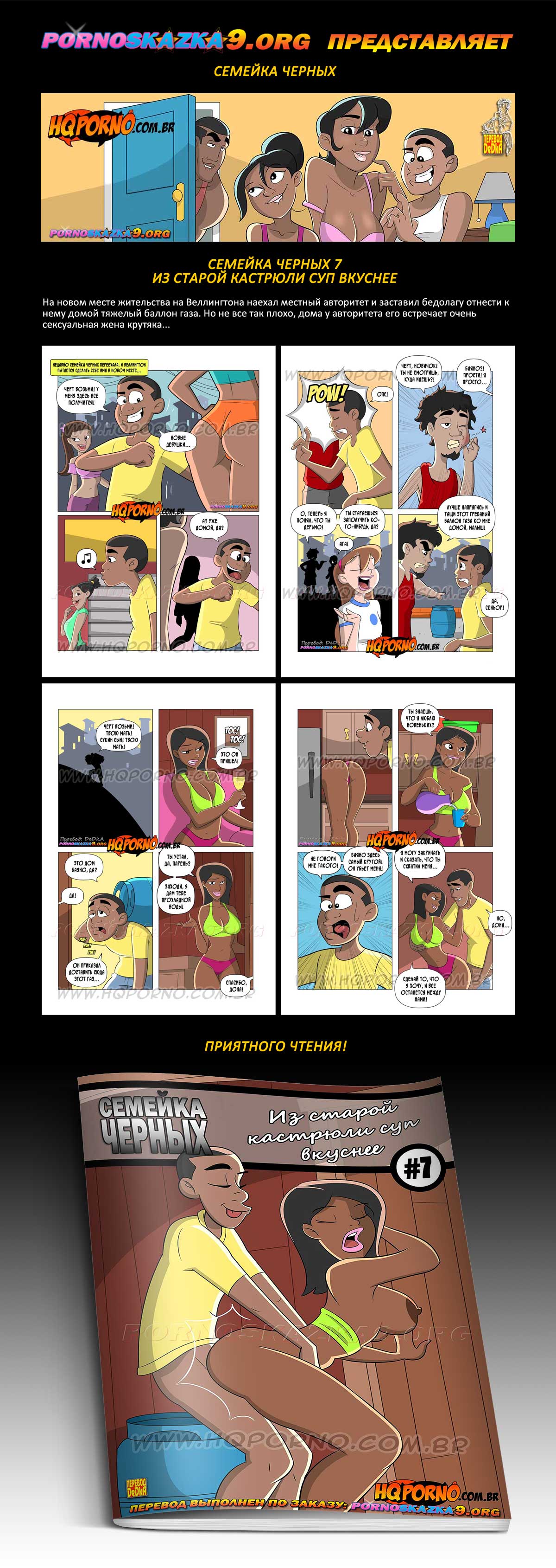 Порно комикс Семейка черных. Часть 7: Из старой кастрюли суп вкуснее. На новом месте жительства на Веллингтона наехал местный авторитет и заставил бедолагу отнести к нему домой тяжелый баллон газа. Но не все так плохо, дома у авторитета его встречает очень сексуальная жена крутяка…